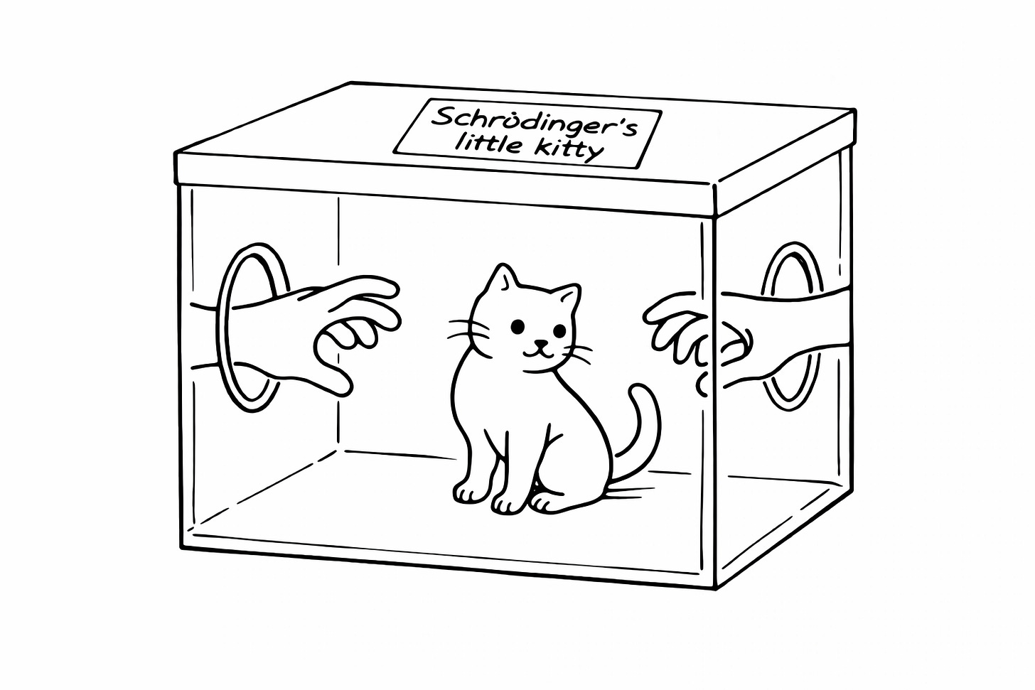 In 1935, the physicist Erwin Schrödinger proposed a thought experiment. A cat is placed in a sealed box, along with a small amount of radioactive material. If a single atom decays, a mechanism triggers and the cat dies. Quantum mechanics says the atom is in a superposition of decayed and not-decayed until it is observed. So what is the cat? Until the box is opened, it is, in a strict quantum mechanical sense, both alive and dead at once.