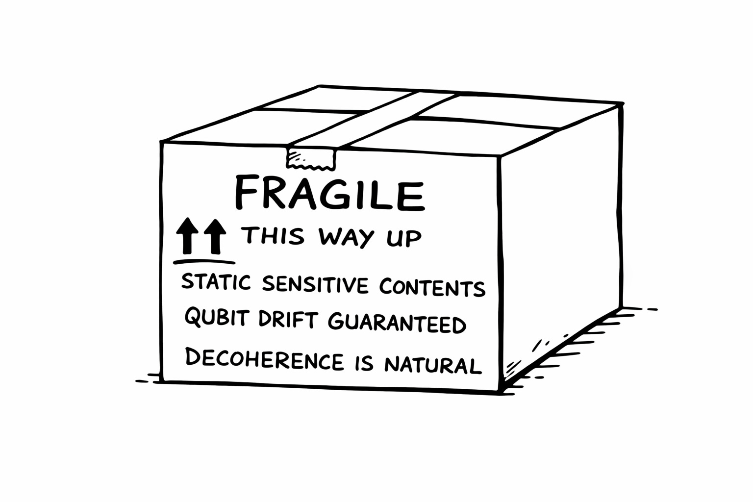 A qubit in superposition is the cat. It must be isolated from its environment, sealed in its box, to preserve the quantum state. Any interaction with the outside world, any stray electromagnetic field, any vibration, any thermal fluctuation, acts like opening the box. The qubit collapses. The state is destroyed.