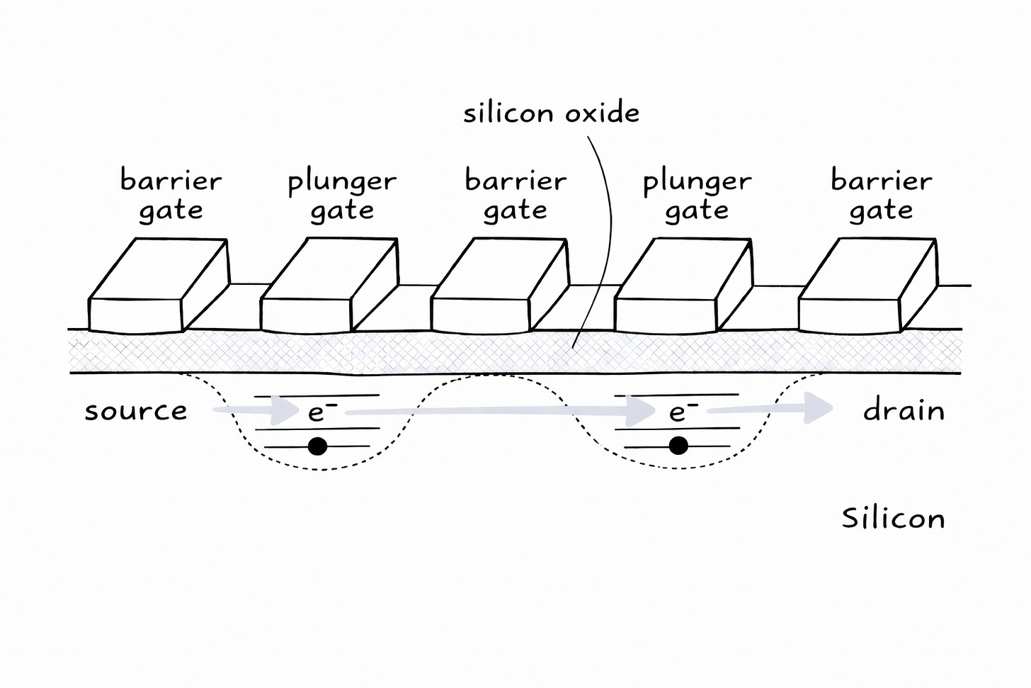 By adjusting the voltages on metal gate electrodes, for example a barrier gate or a plunger gate, surrounding the quantum dot, we can control the number of electrons inside, one by one, all the way down to a single electron. That single electron has a property called spin: it points either up or down. That spin is the qubit.
